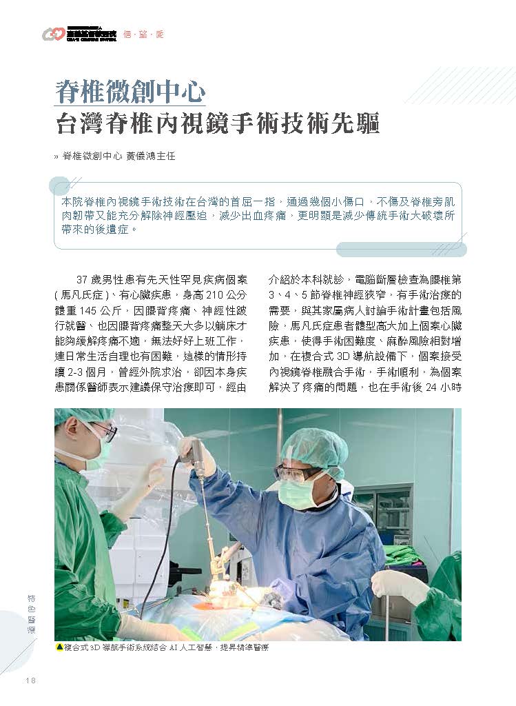 37歲男性患有先天性罕見疾病個案(馬凡氏症)、有心臟疾患,身高210公分 體重145公斤,因腰背疼痛、神經性跛行就醫、也因腰背疼痛整天大多以躺床才能夠緩解疼痛不適,無法好好上班工作,連日常生活自理也有困難,這樣的情形持續2-3個月,曾經外院求治,卻因本身疾患關係醫師表示建議保守治療即可,經由介紹於本科就診,電腦斷層檢查為腰椎第3、4、5節脊椎神經狹窄,有手術治療的需要,與其家屬病人討論手術計畫包括風險,馬凡氏症患者體型高大加上個案心臟疾患,使得手術困難度、麻醉風險相對增加,在複合式3D導航設備下,個案接受內視鏡脊椎融合手術,手術順利,為個案解決了疼痛的問題,也在手術後24小時持助行器下床行走,返家後持續復健漸漸地恢復以往日常生活,個案亦非常感激醫師的救治。