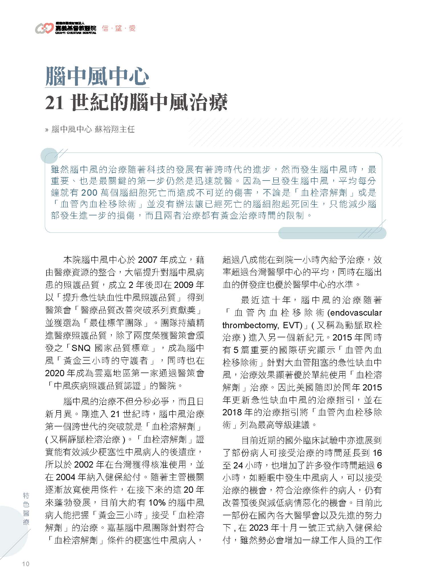 腦中風的治療不但分秒必爭,而且日新月異。剛進入21世紀時,腦中風治療第一個跨世代的突破就是「血栓溶解劑」(又稱靜脈栓溶治療)。「血栓溶解劑」證實能有效減少梗塞性中風病人的後遺症,所以於2002年在台灣獲得核准使用,並在2004年納入健保給付。隨著主管機關逐漸放寬使用條件,在接下來的這20年來蓬勃發展,目前大約有10%的腦中風病人能把握「黃金三小時」接受「血栓溶解劑」的治療。嘉基腦中風團隊針對符合「血栓溶解劑」條件的梗塞性中風病人,超過八成能在到院一小時內給予治療,效率超過台灣醫學中心的平均,同時在腦出血的併發症也優於醫學中心的水準。