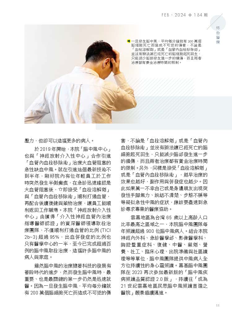 雲嘉地區為台灣 65 歲以上高齡人口比率最高之區域之一,本院腦中風團隊每年照護超過 900 位腦中風病人。結合本院神經內外科、急診醫學部、影像醫學科、胸腔暨重症科、復健、中醫、藥劑、營養、社工、臨床心理、出院準備與社區護理等等單位,腦中風團隊提供中風病人全方位持續性的身心靈照護。嘉基腦中風團隊在2023再次參加最新版的「腦中風疾病照護品質認證2.0版」,持續往「成為21世紀雲嘉地區民眾腦中風照護首選之醫院」願景繼續邁進。