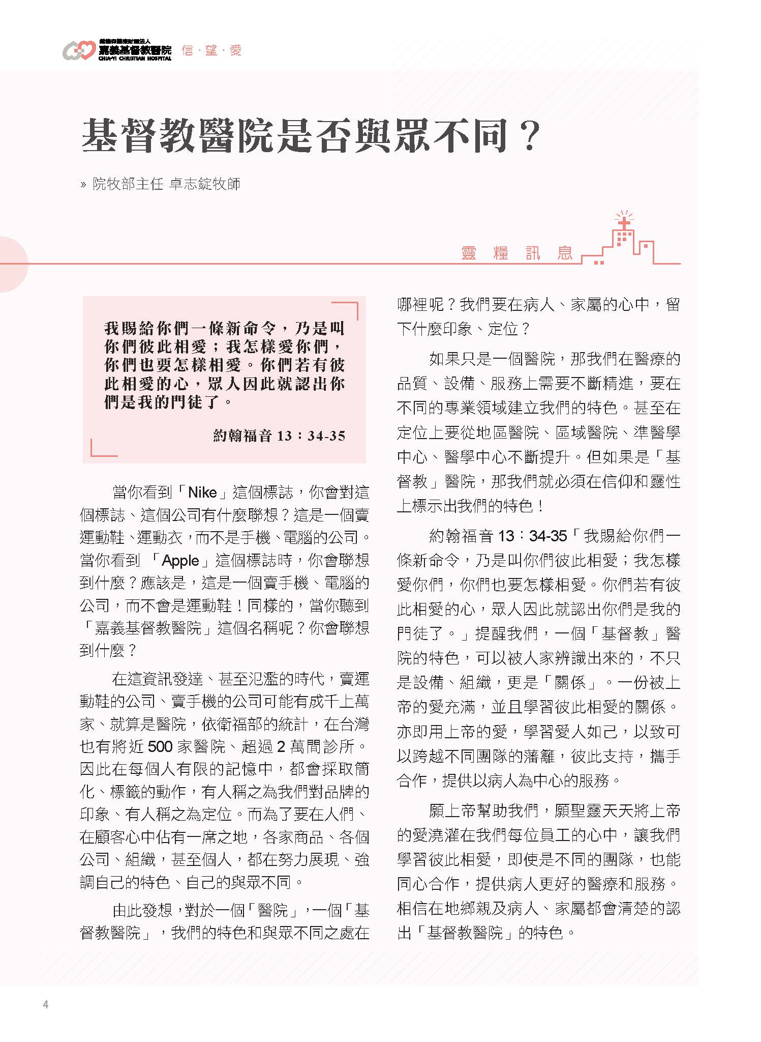 願上帝幫助我們,願聖靈天天將上帝的愛澆灌在我們每位員工的心中,讓我們學習彼此相愛,即使是不同的團隊,也能同心合作,提供病人更好的醫療和服務。相信在地鄉親及病人、家屬都會清楚的認出「基督教醫院」的特色。