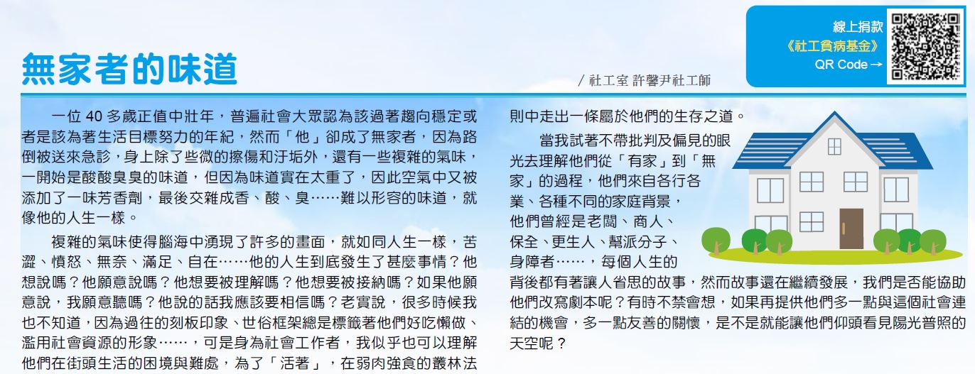複雜的氣味使得腦海中湧現了許多的畫面,就如同人生一樣,苦澀、憤怒、無奈、滿足、自在…..他的人生到底發生了甚麼事情?他想說嗎?他願意說嗎?他想要被理解嗎?他想要被接納嗎?如果他願意說,我願意聽嗎?他說的話我應該要相信嗎?老實說,很多時候我也不知道,因為過往的刻板印象、世俗框架總是標籤著他們好吃懶做、濫用社會資源的形象…,可是身為社會工作者,我似乎也可以理解他們在街頭生活的困境與難處,為了”活著”,在弱肉強食的叢林法則中走出一條屬於他們的生存之道。
