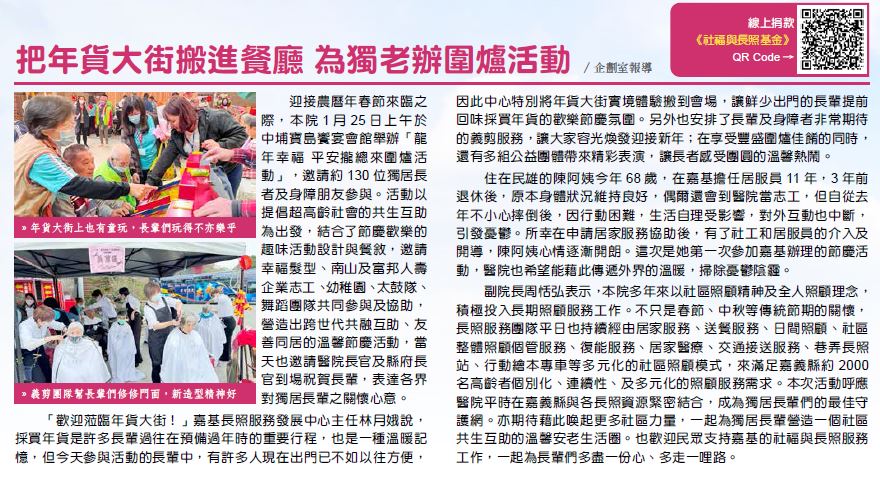 迎接農曆年春節來臨之際,本院1月25日上午於中埔寶島饗宴會館舉辦「龍年幸福 平安攏總來圍爐活動」,邀請約130位獨居長者及身障朋友參與。活動以提倡超高齡社會的共生互助為出發,結合了節慶歡樂的趣味活動設計與餐敘,邀請幸福髮型、南山及富邦人壽企業志工、幼稚園、太鼓隊、舞蹈團隊共同參與及協助,營造出跨世代共融互助、友善同居的溫馨節慶活動,當天也邀請醫院長官及縣府長官到場祝賀長輩,表達各界對獨居長輩之關懷心意。