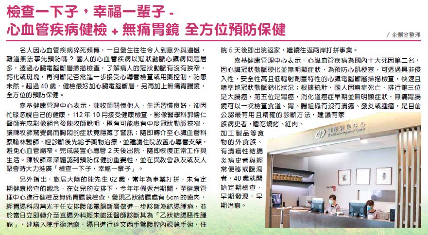 嘉基健康管理中心表示,心臟血管疾病為國內十大死因第二名,因心臟冠狀動脈硬化並無明顯症狀,為預防心肌梗塞,可透過具非侵入性,安全性高且低輻射劑量特性的心臟電腦斷層掃描檢查,快速且精準地冠狀動脈鈣化狀況;根據統計,國人因癌症死亡,排行第三位是大腸癌,第五位是胃癌,消化道癌症早期並無明顯症狀,無痛胃腸鏡可以一次檢查食道、胃、腸組織有沒有潰瘍、發炎或腫瘤,是目前公認最有用且精確的診斷方法,建議有家族病史者,嗜吃燒烤、紅肉、加工製品等食物的外食族、有潰瘍性結腸炎病史者與經常便秘或腹瀉者,40 歲就開始定期檢查,早期發現,早期治療。