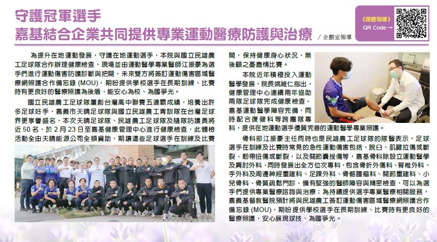 為提升在地運動發展,守護在地運動選手,嘉義基督教醫院與國立民雄農工足球隊合作辦理健康檢查,現場並由嘉基運動醫學專業醫師江振豪為選手們進行運動傷害防護診斷與把關,未來雙方將簽訂運動傷害區域醫療網照護合作備忘錄(MOU),期盼提供學校選手在長期訓練、比賽時有更良好的醫療照護為後盾,能安心為校、為國爭光。