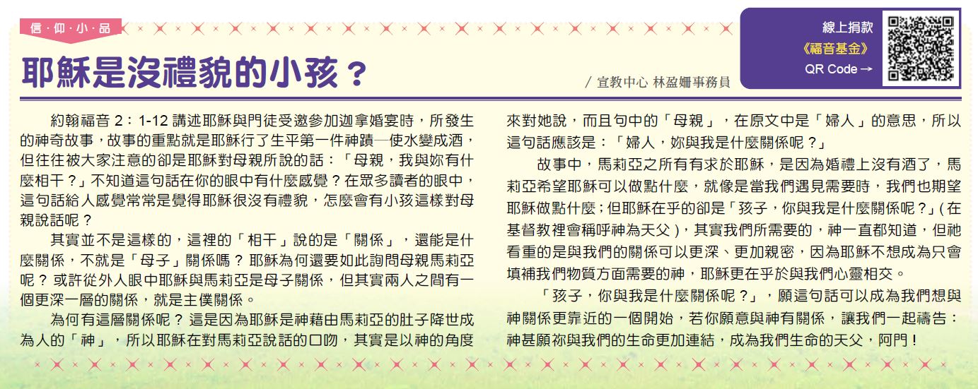 約翰福音2:1-12講述耶穌與門徒受邀參加迦拿婚宴時,所發生的神奇故事,故事的重點就是耶穌行了生平第一件神蹟─使水變成酒,但往往被大家注意的卻是耶穌對母親所說的話:「母親,我與妳有什麼相干?」不知道這句話在你的眼中有什麼感覺? 在眾多讀者的眼中,這句話給人感覺常常是覺得耶穌很沒有禮貌,怎麼會有小孩這樣對母親說話呢?