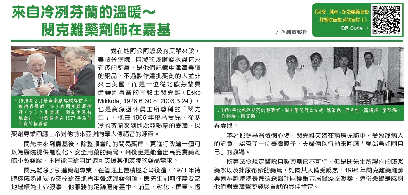 對在地阿公阿嬤級的長輩來說,「美國仔病院」自製的咳嗽藥水與抹尿布疹的藥膏,是他們記憶中津津樂道的藥品,不過製作這批藥劑的人並非來自美國,而是一位從北歐芬蘭具備藥劑專業的宣教士閔克難(Esko Mikkola, 1928.6.30〜2003.3.24),也是資深退休員工所尊稱的「閔先生」,他在1965年帶著妻兒,從寒冷的芬蘭來到地處亞熱帶的臺灣,以藥劑專業回應上帝對他前來亞洲向華人傳福音的呼召。