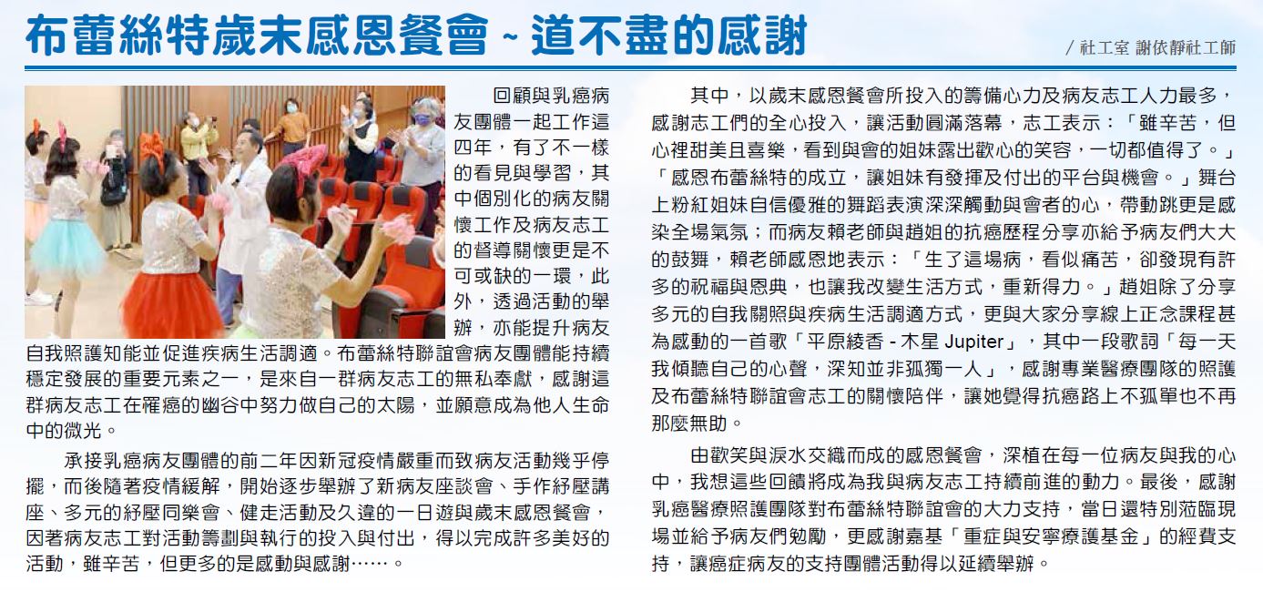 其中,以歲末感恩餐會所投入的籌備心力及病友志工人力最多,感謝志工們的全心投入,讓活動圓滿落幕,志工表示:「雖辛苦,但心裡甜美且喜樂,看到與會的姐妹露出歡心的笑容,一切都值得了。」「感恩布蕾絲特的成立,讓姐妹有發揮及付出的平台與機會。」舞台上粉紅姐妹自信優雅的舞蹈表演深深觸動與會者的心,帶動跳更是感染全場氣氛;而病友賴老師與趙姐的抗癌歷程分享亦給予病友們大大的鼓舞,賴老師感恩地表示:「生了這場病,看似痛苦,卻發現有許多的祝福與恩典,也讓我改變生活方式,重新得力。」趙姐除了分享多元的自我關照與疾病生活調適方式,更與大家分享線上正念課程甚為感動的一首歌「平原綾香-木星Jupiter」,其中一段歌詞「每一天我傾聽自己的心聲,深知並非孤獨一人」,感謝專業醫療團隊的照護及布蕾絲特聯誼會志工的關懷陪伴,讓她覺得抗癌路上不孤單也不再那麼無助。