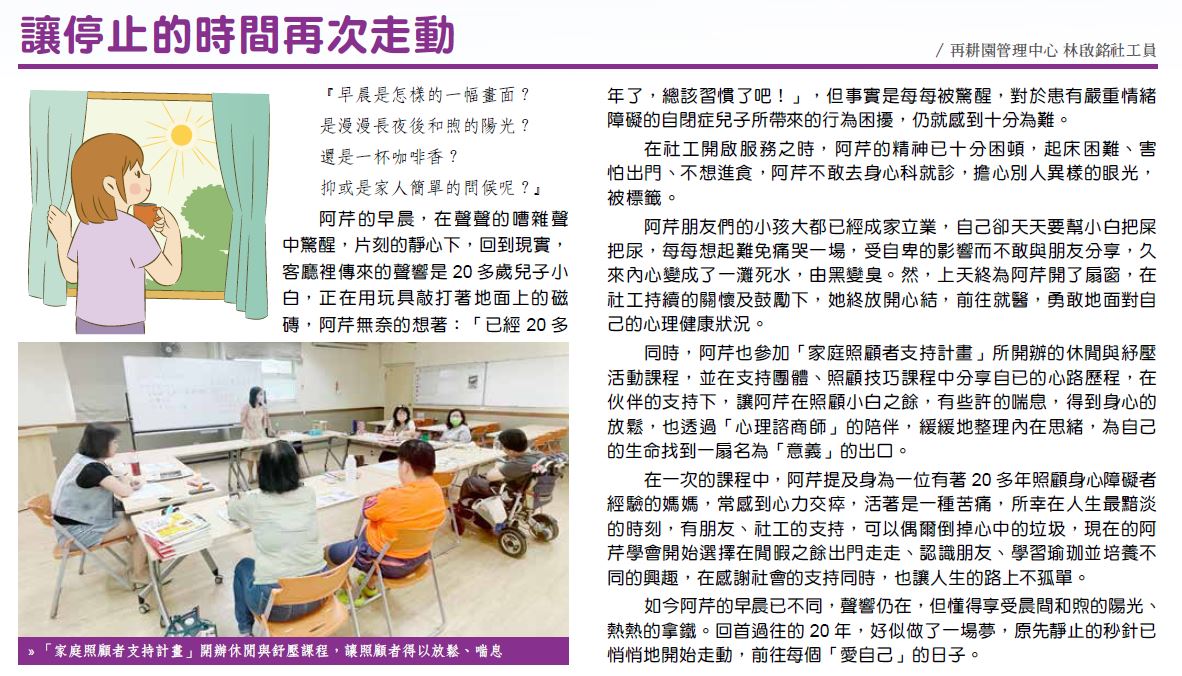 同時,阿芹也參加「家庭照顧者支持計畫」所開辦的休閒與紓壓活動課程,並在支持團體、照顧技巧課程中分享自已的心路歷程,在伙伴的支持下,讓阿芹在照顧小白之餘,有些許的喘息,得到身心的放鬆,也透過「心理諮商師」的陪伴,緩緩地整理內在思緒,為自己的生命找到一扇名為「意義」的出口。