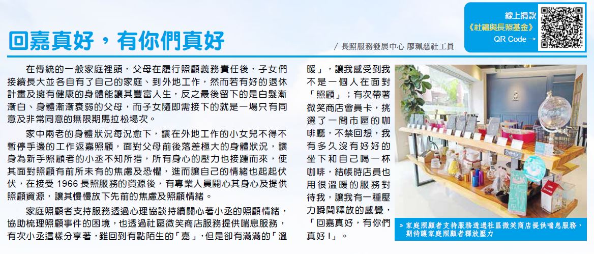家庭照顧者支持服務透過心理協談持續關心著小丞的照顧情緒,協助梳理照顧事件的困境,也透過社區微笑商店服務提供喘息服務,有次小丞這樣分享著,雖回到有點陌生的「嘉」,但是卻有滿滿的「溫暖」,讓我感受到我不是一個人在面對「照顧」;有次帶著微笑商店會員卡,挑選了一間市區的咖啡廳,不禁回想,我有多久沒有好好的坐下和自己喝一杯咖啡,結帳時店員也用很溫暖的服務對待我,讓我有一種壓力瞬間釋放的感覺,「回嘉真好,有你們真好