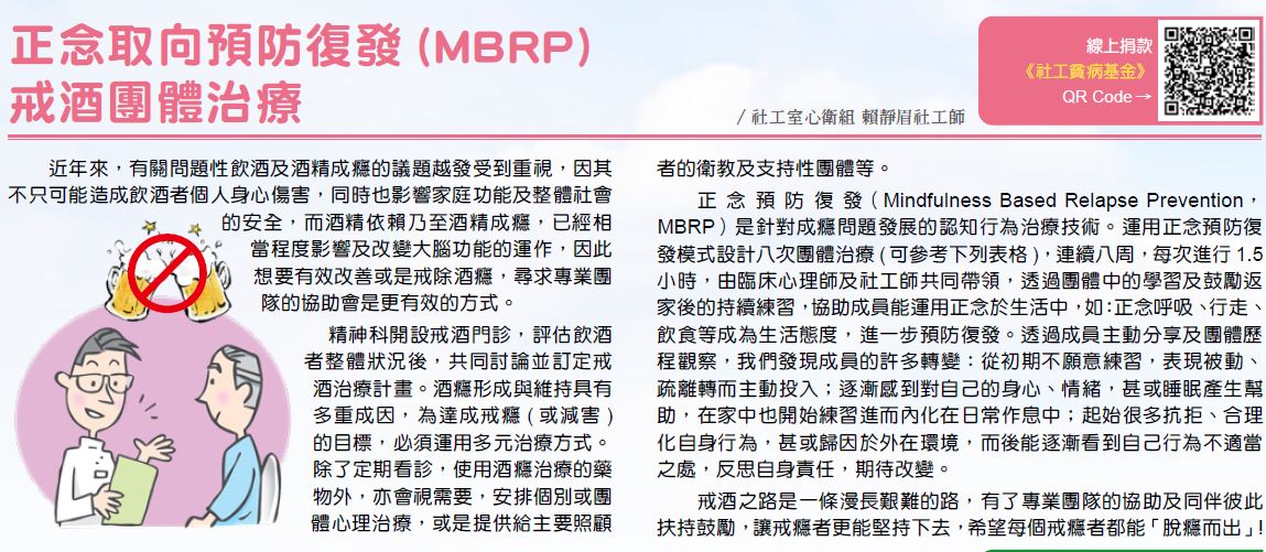 戒酒之路是一條漫長艱難的路,有了專業團隊的協助及同伴彼此扶持鼓勵,讓戒癮者更能堅持下去,希望每個戒癮者都能「脫癮而出」!