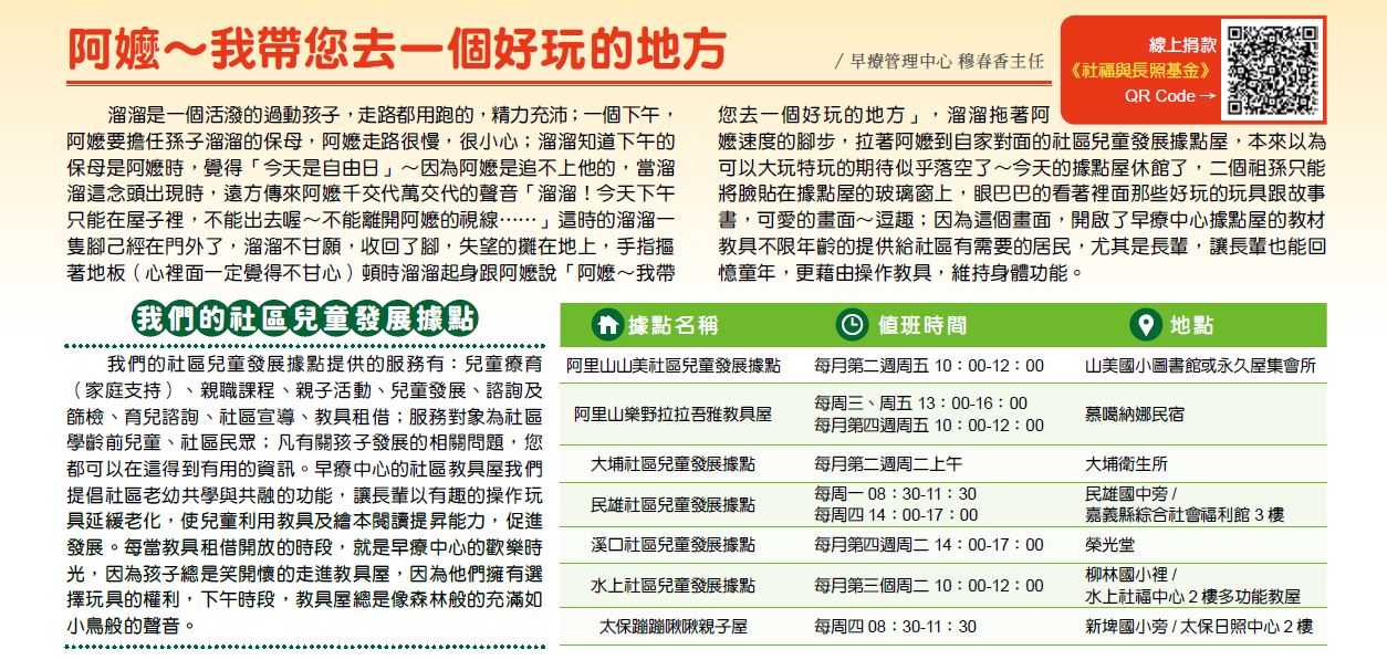 教具租借;服務對象為社區學齡前兒童、社區民眾;凡有關孩子發展的相關問題,您都可以在這得到有用的資訊。早療中心的社區