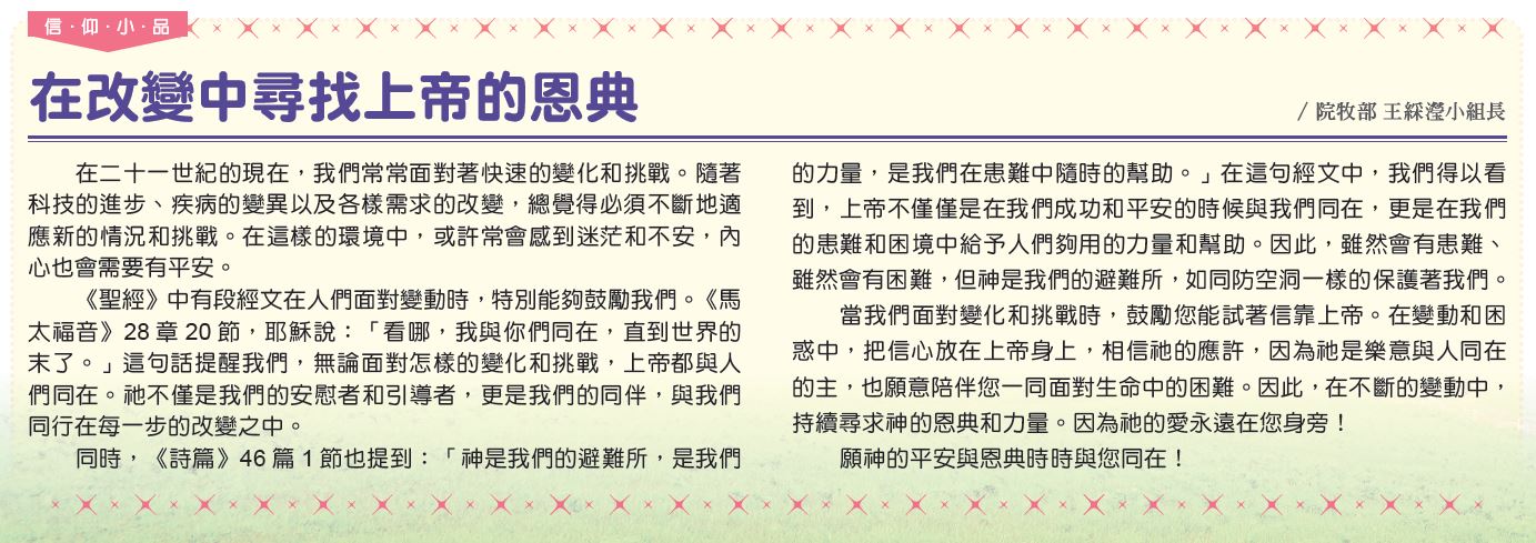 《聖經》中有段經文在人們面對變動時,特別能夠鼓勵我們。《馬太福音》28章20節,耶穌說:「看哪,我與你們同在,直到世界的末了。」這句話提醒我們,無論面對怎樣的變化和挑戰,上帝都與人們同在。祂不僅是我們的安慰者和引導者,更是我們的同伴,與我們同行在每一步的改變之中。