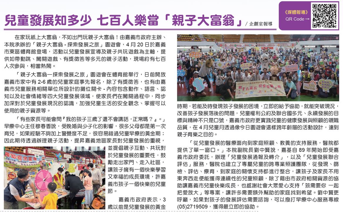 在家玩紙上大富翁,不如出門玩親子大富翁!由嘉義市政府主辦、本院承辦的「親子大富翁-探索發展之旅」園遊會,4月20日於嘉義市東區體育館登場,活動以兒童發展宣導及親子共玩遊戲為主軸,提供如帶動跳、闖關遊戲、有獎徵答等多元的親子活動,現場約有七百人次參與,相當熱鬧。