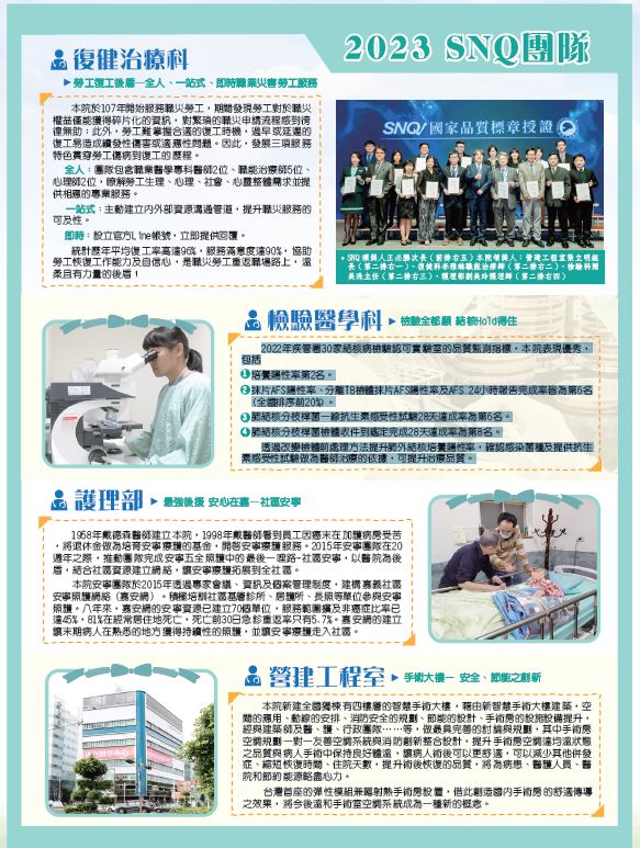 本院於107年開始服務職災勞工,期間發現勞工對於職災權益僅能獲得碎片化的資訊,對繁瑣的職災申請流程感到徬徨無助;此外,勞工難掌握合適的復工時機,過早或延遲的復工易造成續發性傷害或適應性問題。因此,本單位發展三項服務特色貫穿勞工傷病到復工的歷程。