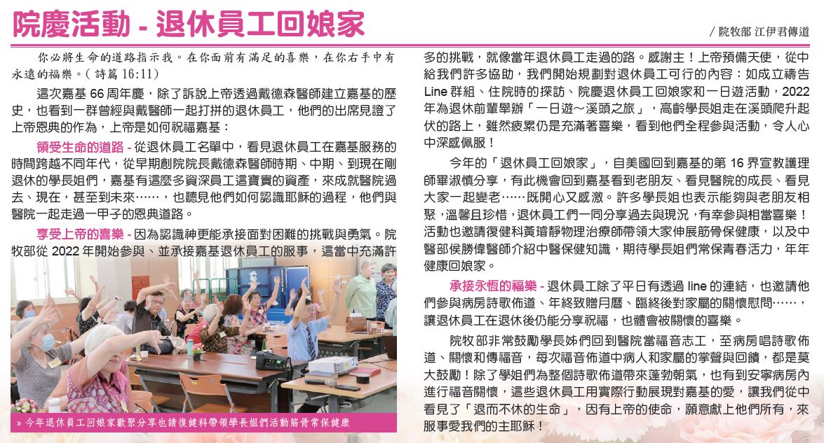享受上帝的喜樂-因為認識神更能承接面對困難的挑戰與勇氣。院牧部從2022年開始參與、並承接嘉基退休員工的服事,這當中充滿許多的挑戰,就像當年退休員工走過的路。感謝主!上帝預備天使,從中給我們許多協助,我們開始規劃對退休員工可行的內容:如成立禱告Line群組、住院時的探訪、院慶退休員工回娘家和一日遊活動,2022年為退休前輩舉辦「一日遊〜溪頭之旅」,高齡學長姐走在溪頭爬升起伏的路上,雖然疲累仍是充滿著喜樂,看到他們全程參與活動,令人心中深感佩服!