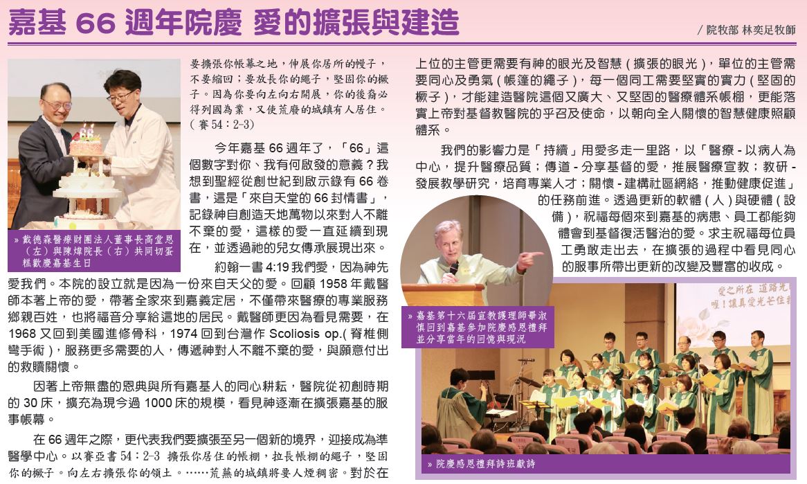 今年嘉基66週年了,「66」這個數字對你、我有何啟發的意義?我想到聖經從創世紀到啟示錄有66卷書,這是「來自天堂的66封情書」,記錄神自創造天地萬物以來對人不離不棄的愛,這樣的愛一直延續到現在,並透過祂的兒女傳承展現出來。
