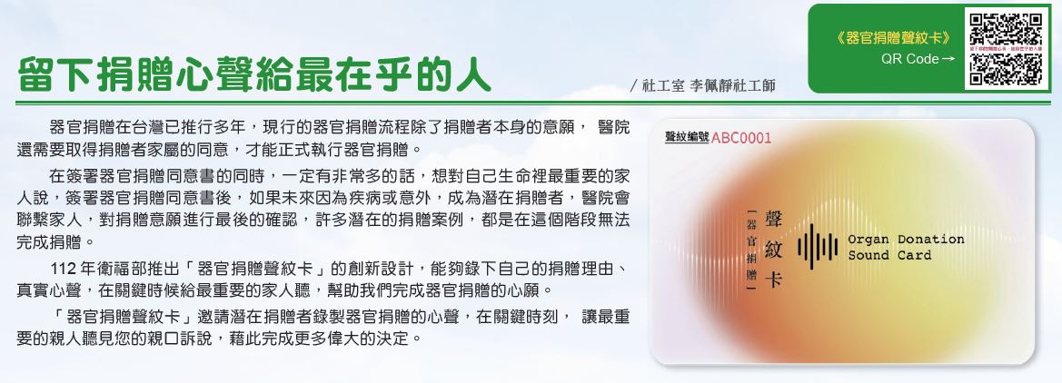112年衛福部推出「器官捐贈聲紋卡」的創新設計,能夠錄下自己的捐贈理由、真實心聲,在關鍵時候給最重要的家人聽,幫助我們完成器官贈的心願。