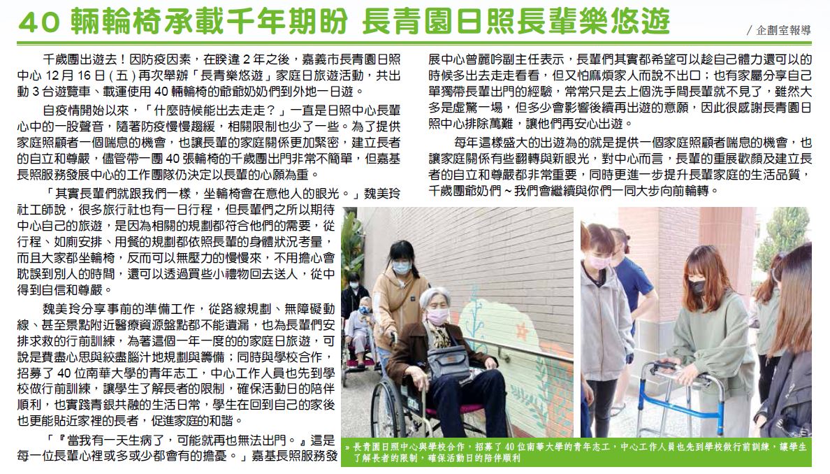 千歲團出遊去!因防疫因素,在睽違2 年之後,嘉義市長青園日照中心12 月16 日( 五) 再次舉辦「長青樂悠遊」家庭日旅遊活動,共出動3 台遊覽車、載運使用40 輛輪椅的爺爺奶奶們到外地一日遊。