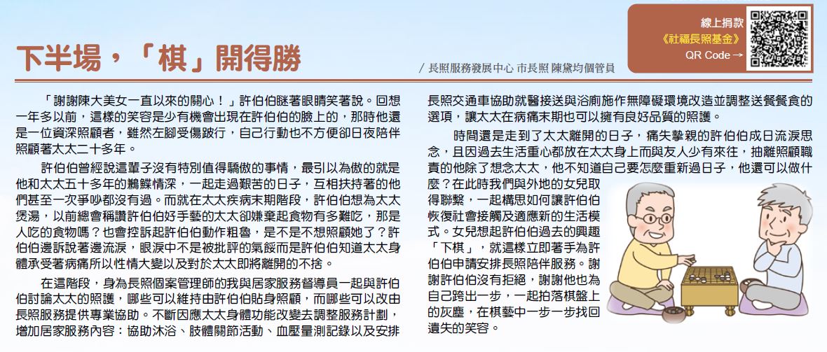 時間還是走到了太太離開的日子,痛失摯親的許伯伯成日流淚思念,且因過去生活重心都放在太太身上而與友人少有來往,抽離照顧職責的他除了想念太太,他不知道自己要怎麼重新過日子,他還可以做什麼?在此時我們與外地的女兒取得聯繫,一起構思如何讓許伯伯恢復社會接觸及適應新的生活模式。女兒想起許伯伯過去的興趣「下棋」,就這樣立即著手為許伯伯申請安排長照陪伴服務。謝謝許伯伯沒有拒絕,謝謝他也為自己跨出一步,一起拍落棋盤上的灰塵,在棋藝中一步一步找回遺失的笑容。