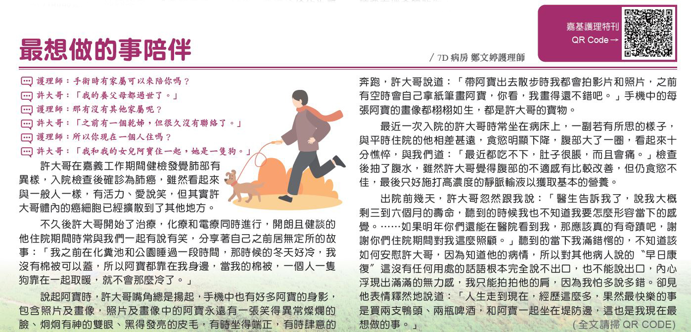 關於病痛,有的病人能順利痊癒,但有的卻不敵病魔、撒手人寰;有的有家人陪伴,有的孤寂一人,陪伴及聆聽其實能帶來莫大的力量,有時人們只是希望自己的難受能得到同理,藉以抒發。每個病人都有不同的故事、不同的人生,每個故事都值得我們聆聽,但臨床上瑣碎的事物往往填滿了上班的每一個空隙,讓我們沒有足夠的時間去了解、陪伴病人、傾聽他們的內心,疏遠了護、醫、病關係,也錯失了了解病人的機會……我想起許大哥說的「人生最快樂的事」,其實或許很簡單──對我而言,在護理這條路上,如果忙碌之餘能靜下心、停下腳步給予病人溫暖,適時陪伴與傾聽,就是我現在最想做的事吧。