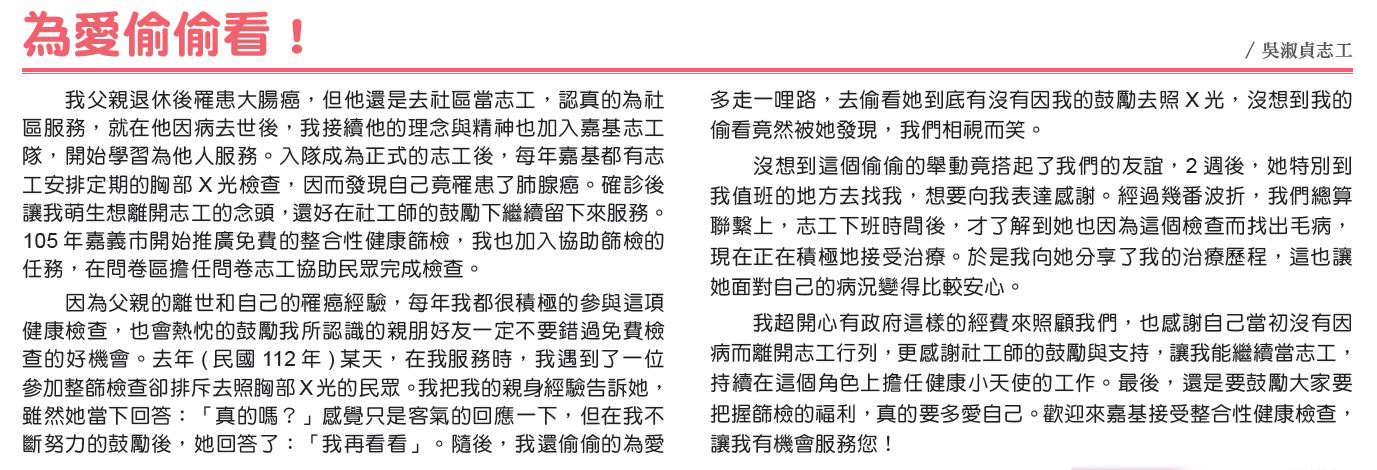 因為父親的離世和自己的罹癌經驗,每年我都很積極的參與這項健康檢查,也會熱忱的鼓勵我所認識的親朋好友一定不要錯過免費檢查的好機會。去年(民國112年)某天,在我服務時,我遇到了一位參加整篩檢查卻排斥去照胸部X光的民眾。我把我的親身經驗告訴她,雖然她當下回答:「真的嗎?」感覺只是客氣的回應一下,但在我不斷努力的鼓勵後,她回答了:「我再看看」。隨後,我還偷偷的為愛多走一哩路,去偷看她到底有沒有因我的鼓勵去照X光,沒想到我的偷看竟然被她發現,我們相視而笑。