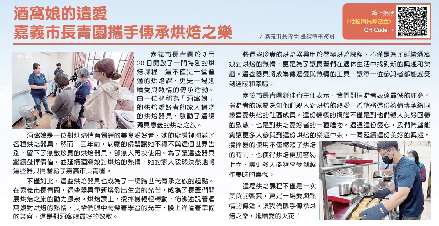嘉義市長青園將這些珍貴的烘焙器具用於舉辦烘焙課程,不僅是為了延續酒窩娘對烘焙的熱情,更是為了讓長輩們在退休生活中找到新的興趣和樂趣。這些器具將成為傳遞愛與熱情的工具,讓每一位參與者都能感受到溫暖和幸福。