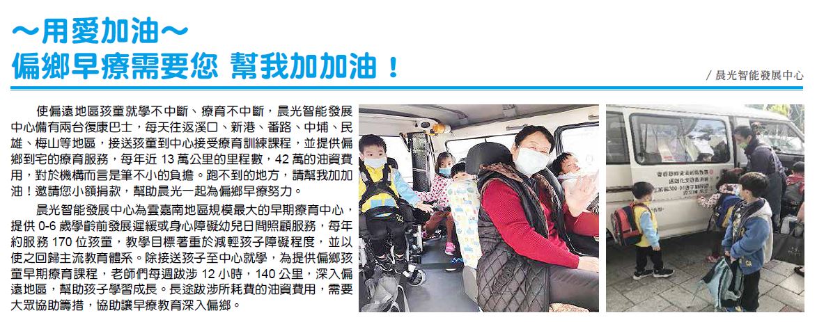晨光智能發展中心為雲嘉南地區規模最大的早期療育中心,提供0-6 歲學齡前發展遲緩或身心障礙幼兒日間照顧服務,每年約服務170 位孩童,教學目標著重於減輕孩子障礙程度,並以使之回歸主流教育體系。除接送孩子至中心就學,為提供偏鄉孩童早期療育課程,老師們每週跋涉12 小時,140 公里,深入偏遠地區,幫助孩子學習成長。長途跋涉所耗費的油資費用,需要大眾協助籌措,協助讓早療教育深入偏鄉。