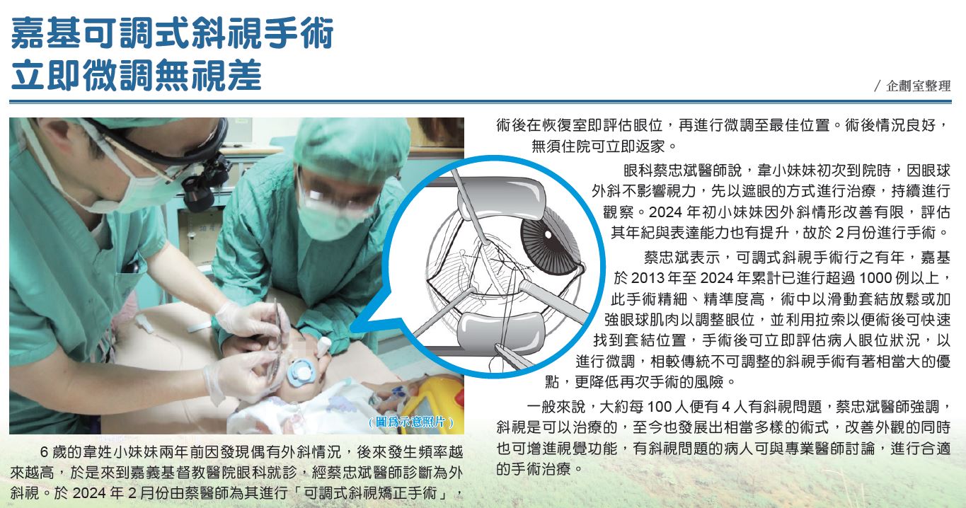 6歲的韋姓小妹妹兩年前因發現偶有外斜情況,後來發生頻率越來越高,於是來到嘉義基督教醫院眼科就診,經蔡忠斌醫師診斷為外斜視。於2024年2月份由蔡醫師為其進行「可調式斜視矯正手術」,術後在恢復室即評估眼位,再進行微調至最佳位置。術後情況良好,無須住院可立即返家。