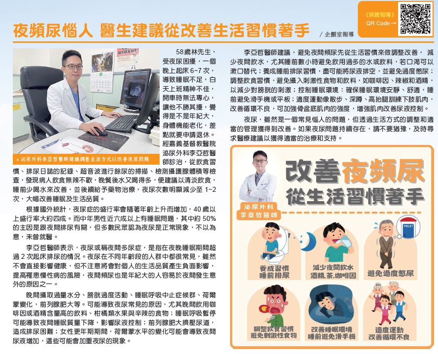 58歲林先生,受夜尿困擾,一個晚上起床6~7次,導致睡眠不足,白天上班精神不佳,開車時無法專心,讓他不勝其擾,覺得是不是年紀大,身體機能老化,差點就要申請退休。經嘉義基督教醫院泌尿外科李亞哲醫師診治,從飲食習慣、排尿日誌的記錄、超音波進行餘尿的掃描、檢測攝護腺體積等檢查,發現病人飲食無辣不歡,晚餐後水又喝得多,便建議以清淡飲食,睡前少喝水來改善,並後續給予藥物治療,夜尿次數明顯減少至1~2次,大幅改善睡眠及生活品質。