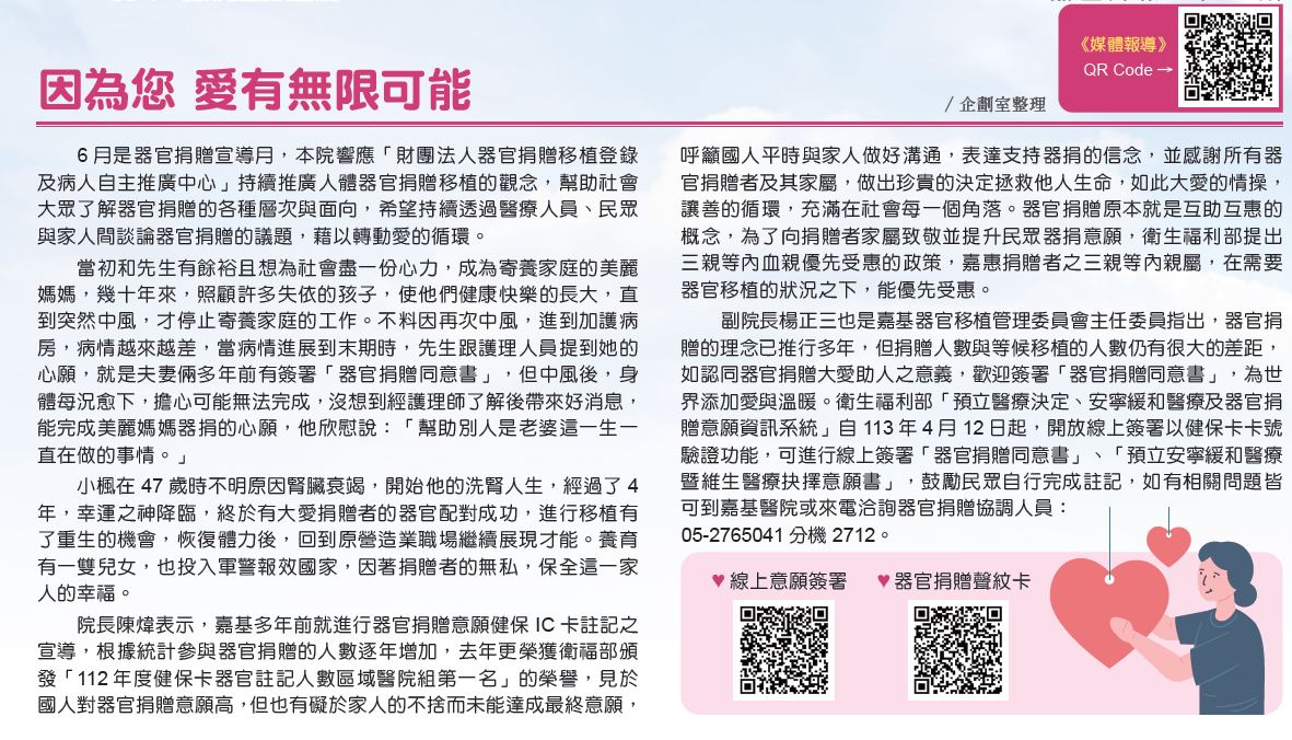 6月是器官捐贈宣導月,嘉義基督教醫院響應『財團法人器官捐贈移植登錄及病人自主推廣中心』持續推廣人體器官捐贈移植的觀念,幫助社會大眾了解器官捐贈的各種層次與面向,希望持續透過醫療人員、民眾與家人間談論器官捐贈的議題,藉以轉動愛的循環。