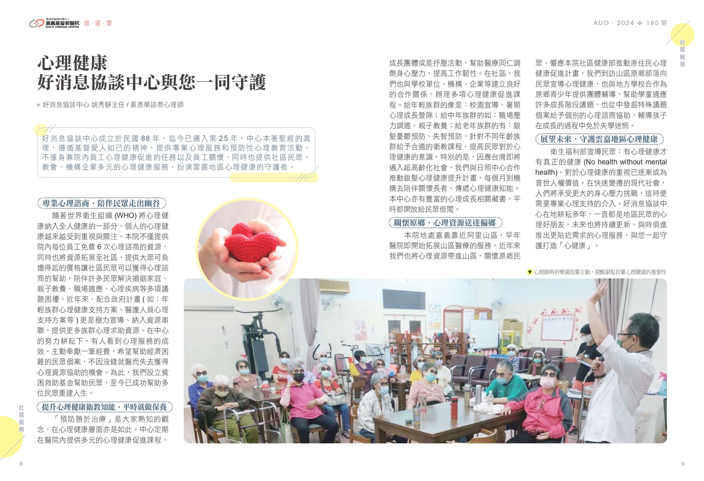 好消息協談中心成立於民國88年,迄今已邁入第25年。中心本著聖經的真理,遵循基督愛人如己的精神,提供專業心理服務和預防性心理教育活動,不僅身肩院內員工心理健康促進的任務以及員工關懷,同時也提供社區民眾、教會、機構企業多元的心理健康服務,扮演雲嘉地區心理健康的守護者。