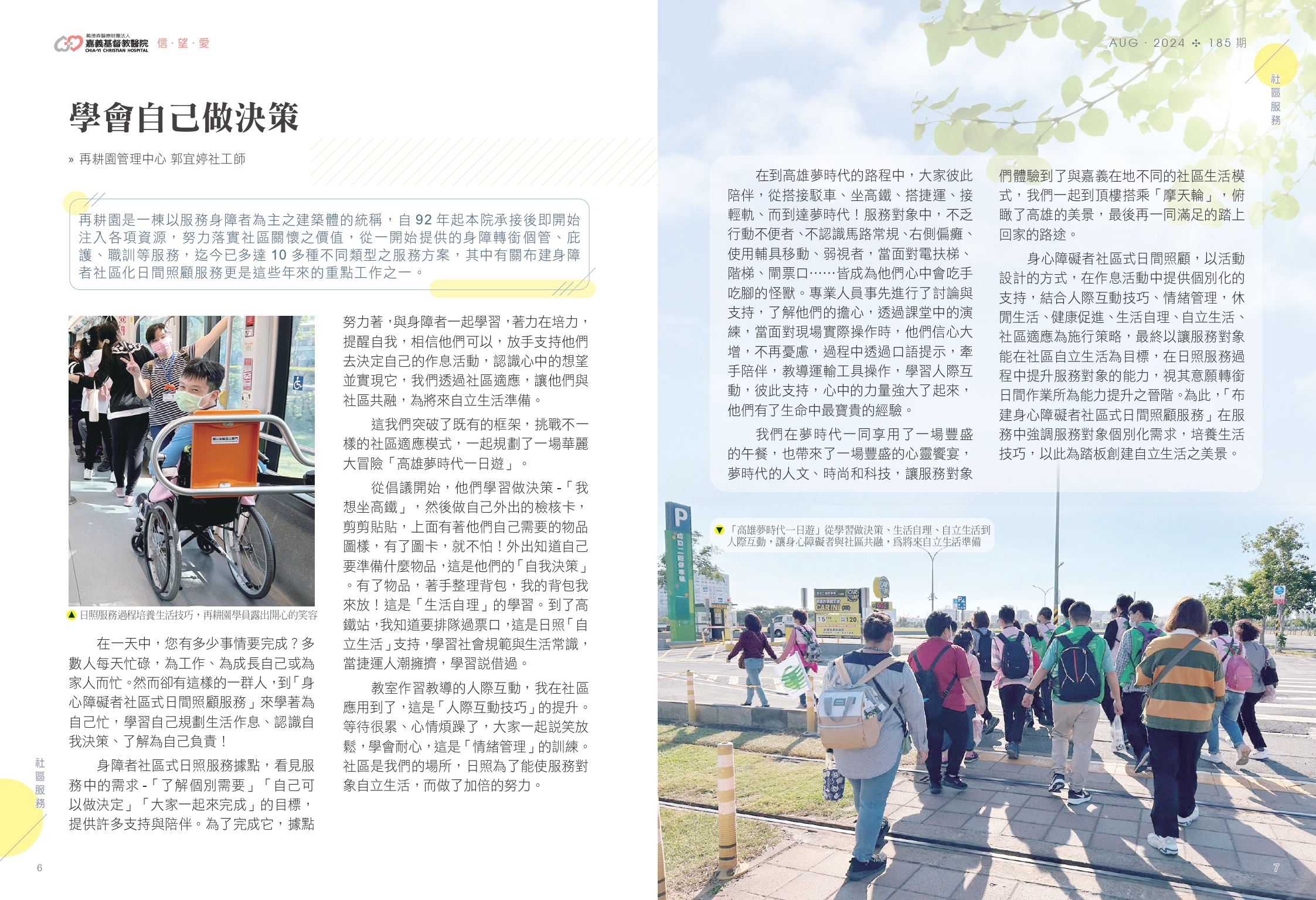 在到高雄夢時代的路程中,大家彼此陪伴著,從搭接駁車、坐高鐵、搭捷運、接輕軌、而到達夢時代!服務對象中,不乏行動不便者、不認識馬路常規、右側偏癱、使用輔具移動、弱視者,當面對電扶梯、階梯、閘票口…皆成為他們心中會吃手吃腳的怪獸。專業人員事先進行了討論與支持,了解他們的擔心,透過課堂中的演練,當面對現場實際操作時,他們信心大增,不再憂慮,過程中透過口語提示,牽手陪伴,教導運輸工具操作,學習人際互動,彼此支持,心中的力量強大了起來,他們有了生命中最寶貴的經驗。
