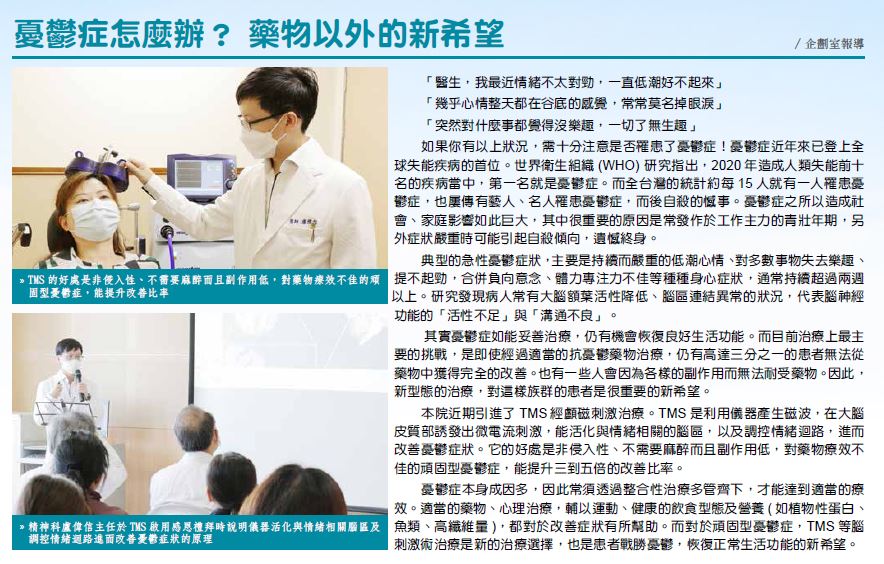 本院近期引進了TMS 經顱磁刺激治療。TMS 是利用儀器產生磁波,在大腦皮質部誘發出微電流刺激,能活化與情緒相關的腦區,以及調控情緒迴路,進而改善憂鬱症狀。它的好處是非侵入性、不需要麻醉而且副作用低,對藥物療效不佳的頑固型憂鬱症,能提升三到五倍的改善比率。