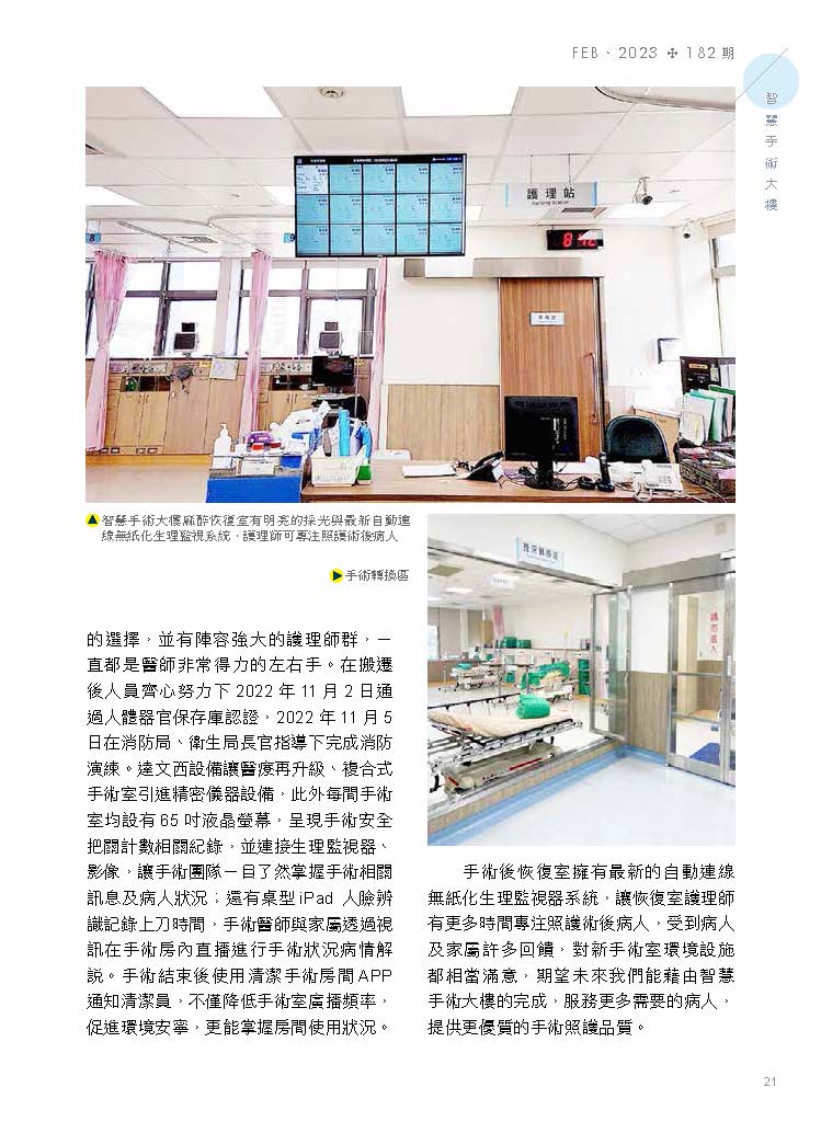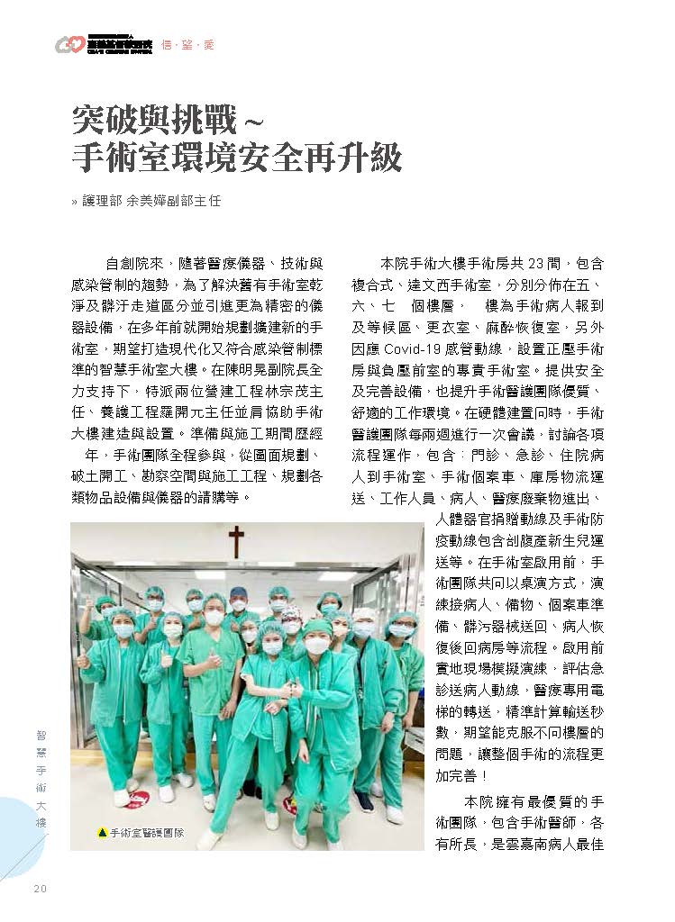 本院擁有最優質的手術團隊,包含手術醫師,各有所長,是雲嘉南病人最佳的選擇,並有陣容強大的護理師群,ㄧ直都是醫師非常得力的左右手。在搬遷後人員齊心努力下11/2通過人體器官保存庫認證,11/5在消防局、衛生局長官指導下完成消防演練。達文西設備讓醫療再升級、複合式手術室引進精密儀器設備,此外每間手術室均設有65吋液晶螢幕,呈現手術安全把關計數相關紀錄,並連接生理監視器、影像,讓手術團隊ㄧ目了然掌握手術相關訊息及病人狀況;還有桌型iPad 人臉辨識記錄上刀時間,手術醫師與家屬透過視訊在手術房內直播進行手術狀況病情解說。手術結束後使用清潔手術房間APP通知清潔員,不僅降低手術室廣播頻率,促進環境安寧,更能掌握房間使用狀況。手術後恢復室擁有最新的生理監視器系統自動連線無紙化,讓恢復室護理師有更多時間專注照護術後病人,受到病人及家屬許多回饋,對新手術室環境設施都相當滿意,期望未來我們能藉由智慧手術大樓的完成,服務更多需要的病人,提供更優質的手術照護品質。