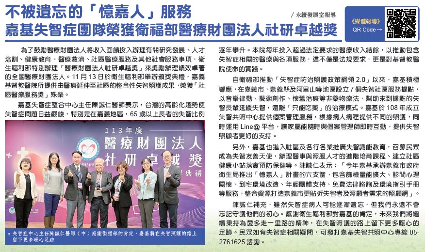 為了鼓勵醫療財團法人將收入回饋投入辦理有關研究發展、人才培訓、健康教育、醫療救濟、社區醫療服務及其他社會服務事項,衛生福利部特別辦理「醫療財團法人社研卓越獎」來獎勵辦理績效卓著的全國醫療財團法人。昨日(13)於衛生福利部舉辦頒獎典禮,嘉義基督教醫院所提供由醫療延伸至社區的整合性失智照護成果,榮獲「社區醫療服務獎」殊榮。