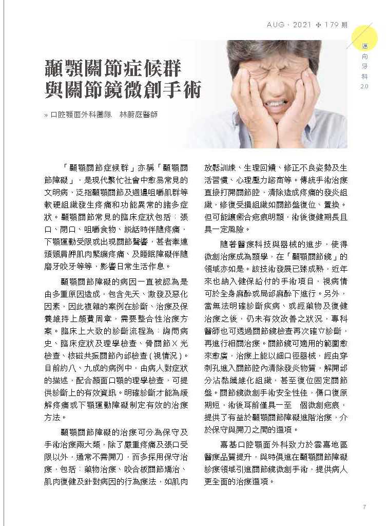 嘉基口腔顎面外科致力於雲嘉地區醫療品質提升,與時俱進在顳顎關節障礙診療領域引進關節鏡微創手術,提供病人更全面的治療選項。
