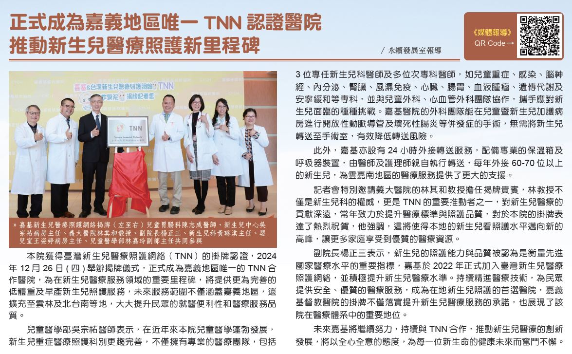本院獲得臺灣新生兒醫療照護網絡(TNN)的掛牌認證,2024年12月26日(四)舉辦揭牌儀式,正式成為嘉義地區唯一的TNN合作醫院,為在新生兒醫療服務領域的重要里程碑,將提供更為完善的低體重及早產新生兒照護服務,未來服務範圍不僅涵蓋嘉義地區,還擴充至雲林及北台南等地,大大提升民眾的就醫便利性和醫療服務品質。
