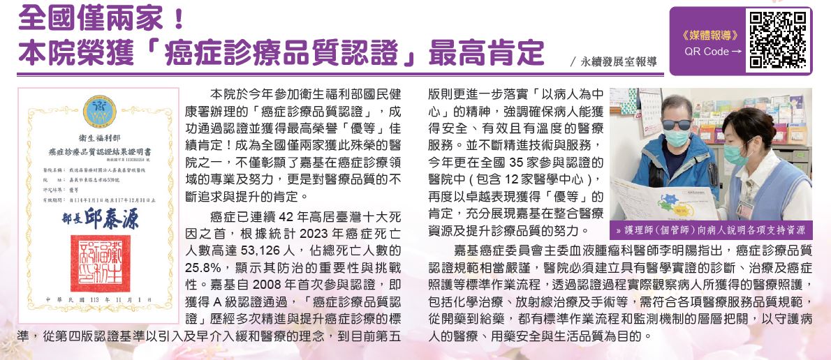 癌症已連續42年高居臺灣十大死因之首,根據統計2023年癌症死亡人數高達53,126人,佔總死亡人數的25.8%,顯示其防治的重要性與挑戰性。嘉基自2008年首次參與認證,即獲得A級認證通過,「癌症診療品質認證」歷經多次精進與提升癌症診療的標準,從第四版認證基準以引入及早介入緩和醫療的理念,到目前第五版則更進一步落實「以病人為中心」的精神,強調確保病人能獲得安全、有效且有溫度的醫療服務。並不斷精進技術與服務,今年更在全國35家參與認證的醫院中(包含12家醫學中心),再度以卓越表現獲得「優等」的肯定,充分展現嘉基在整合醫療資源及提升診療品質的努力。