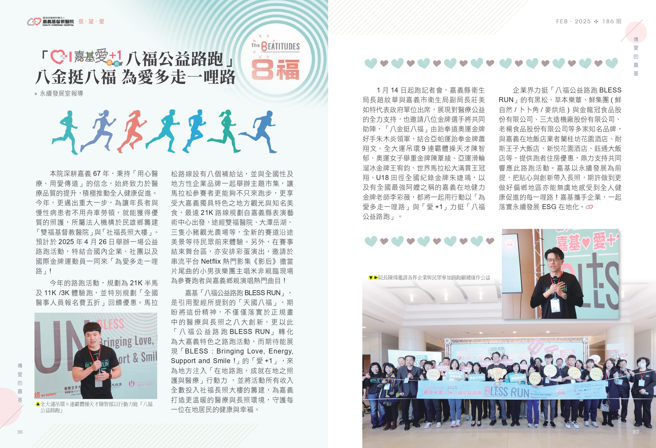 嘉基「八福公益路跑BLESS RUN」,是引用聖經所提到的「天國八福」,期盼將這份精神,不僅僅落實於正規畫中的醫療與長照之八大創新,更以此「八福公益路跑BLESS RUN」轉化為大嘉義特色之路跑活動,而期待能展現「BLESS : Bringing Love, Energy, Support and Smile !」的「愛+1」,來為地方注入「在地路跑,成就在地之照護與醫療」行動力 ,並將活動所有收入全數投入社福長照大樓的籌建,為嘉義打造更溫暖的醫療與長照環境,守護每一位在地居民的健康與幸褔。