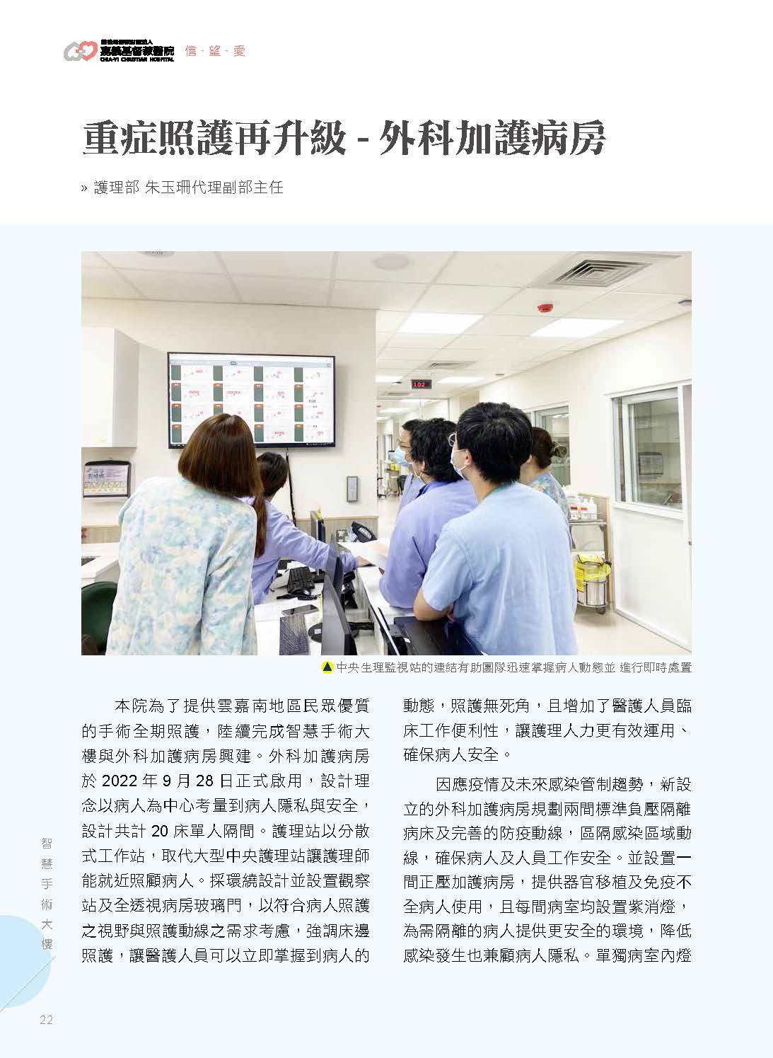 嘉基為了提供雲嘉南地區民眾優質的手術全期照護,本院陸續完成智慧手術大樓與外科加護病房興建。外科加護病房於2022年9月28日正式啟用,。設計理念以病人為中心考量到病人隱私與安全,設計共計20床單人隔間。護理站以分散式工作站,取代大型中央護理站讓護理師能就近照顧病人。採環繞設計並設置觀察站及全透視病房玻璃門,以符合病人照護之視野與照護動線之需求考慮,強調床邊照護,讓醫護人員可以立即掌握到病人的動態,照護無死角,且增加了醫護人員臨床工作便利性,讓護理人力更有效運用、確保病人安全。