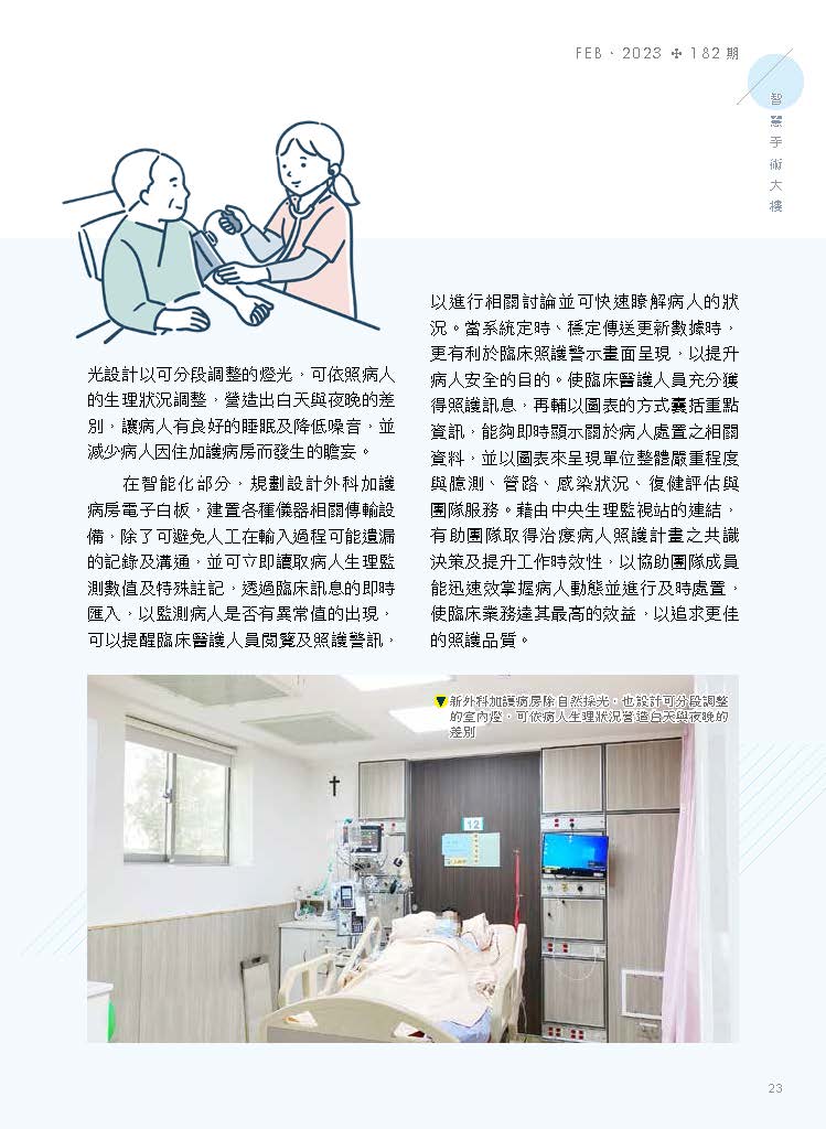在智能化部分,規劃設計外科加護病房電子白板,建置各種儀器相關傳輸設備,除了可避免人工在輸入過程可能遺漏的記錄及溝通,並可立即讀取病人生理監測數值及特殊註記,透過臨床訊息的即時匯入,以監測病人是否有異常值的出現,可以提醒臨床醫護人員閱覽及照護警訊,以進行相關討論並可快速瞭解病人的狀況。當系統定時、穩定傳送更新數據時,更有利於臨床照護警示畫面呈現,以提升病人安全的目的。使臨床醫護人員充分獲得照護訊息,再輔以圖表的方式囊括重點資訊,能夠即時顯示關於病人處置之相關資料,並以圖表來呈現單位整體嚴重程度與臆測、管路、感染狀況、復健評估與團隊服務。並藉由中央生理監視站的連結,有助團隊取得治療病人照護計畫之共識決策及提升工作時效性,以協助團隊成員能迅速效掌握病人動態並進行及時處置,使臨床業務達其最高的效益,以追求更佳的照護品質。