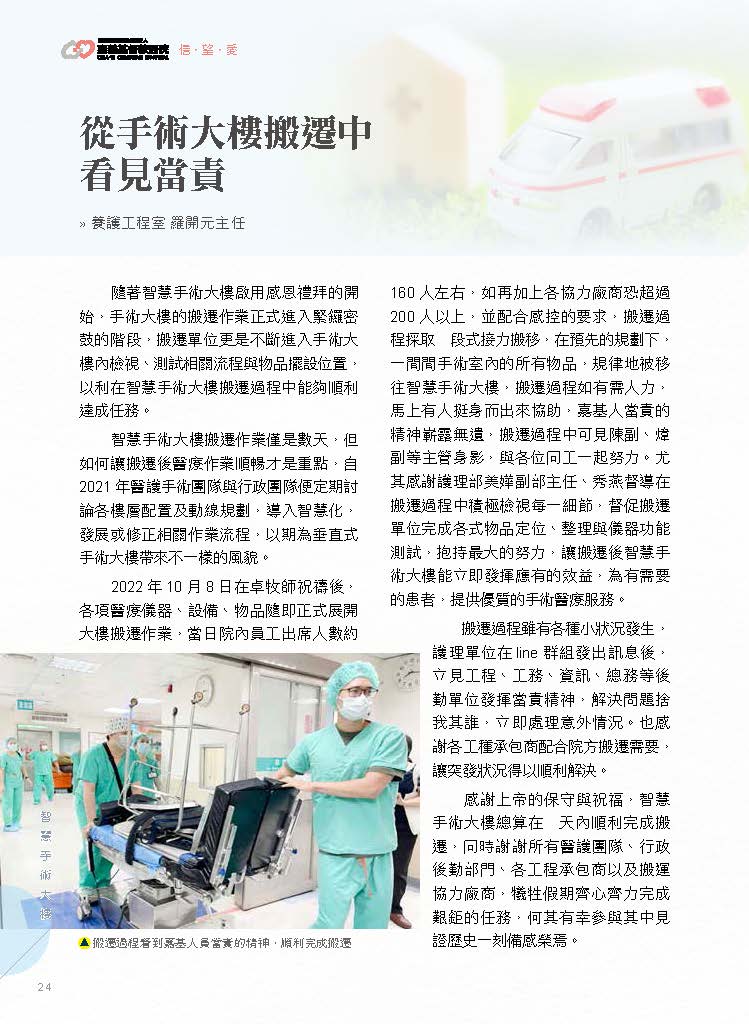 感謝上帝的保守與祝福,智慧手術大樓總算在三天內順利完成搬遷,同時謝謝所有醫護團隊、行政後勤部門、各工程承包商以及搬運協力廠商,犧牲假期齊心齊力完成艱鉅的任務,何其有幸參與其中見證歷史一刻備感榮焉。