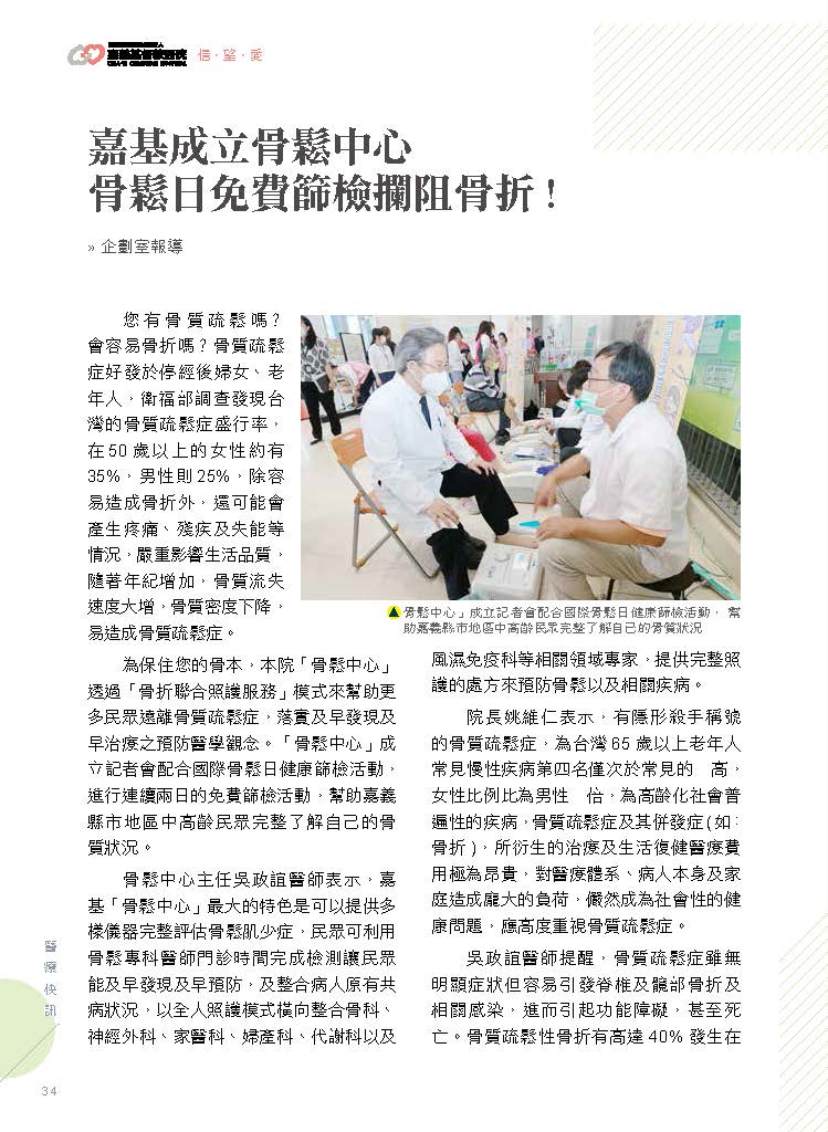 醫療快訊-嘉基成立骨鬆中心 骨鬆日免費篩檢攔阻骨折!