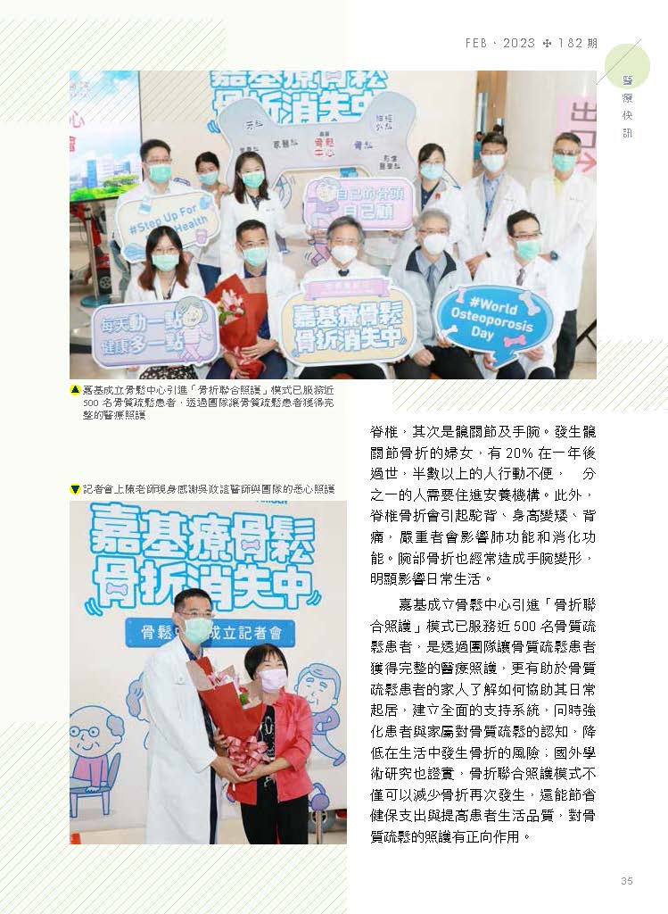 嘉基成立骨鬆中心引進「骨折聯合照護」模式已服務近500名骨質疏鬆患者,是透過醫療照護團隊讓骨質疏鬆患者獲得完整的醫療照護,更有助於骨質疏鬆患者的家人了解如何協助其日常起居,建立全面的支持系統,同時強化患者與家屬對骨質疏鬆的認知,降低在生活中發生骨折的風險;國外學術研究也證實,骨折聯合照護模式不僅可以減少骨折再次發生,還能節省健保支出與提高患者生活品質,對骨質疏鬆的照護有正向作用。