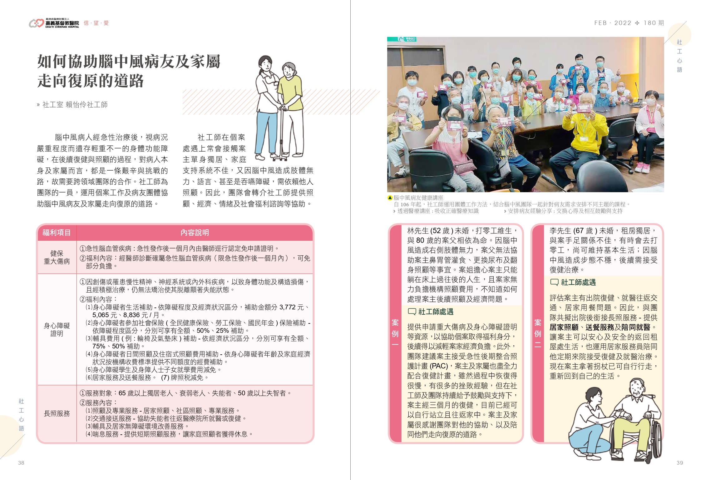 腦中風病人經急性治療後,視病況嚴重程度而遺存輕重不一的身體功能障礙,在後續復健與照顧的過程,對病人本身及家屬而言,都是一條艱辛與挑戰的路,故需要跨領域團隊的合作。社工師為團隊的一員,運用個案工作及病友團體協助腦中風病友及家屬走向復原的道路。