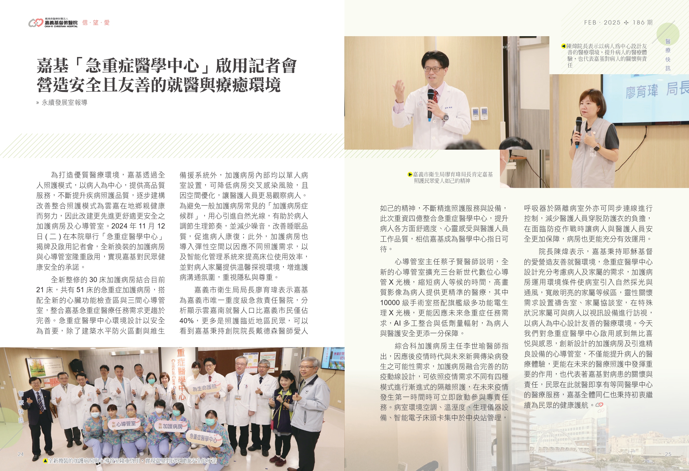 為打造優質醫療環境,嘉基透過全人照護模式,以病人為中心,提供高品質服務,不斷提升疾病照護品質,逐步建構改善整合照護模式為雲嘉在地鄉親健康而努力,因此改建更先進更舒適更安全之加護病房及心導管室。2024年11月12日(二)在嘉義基督教醫院舉行「急重症醫學中心」揭牌及啟用記者會,全新換裝的加護病房與心導管室隆重啟用,實現嘉基對民眾健康安全的承諾。