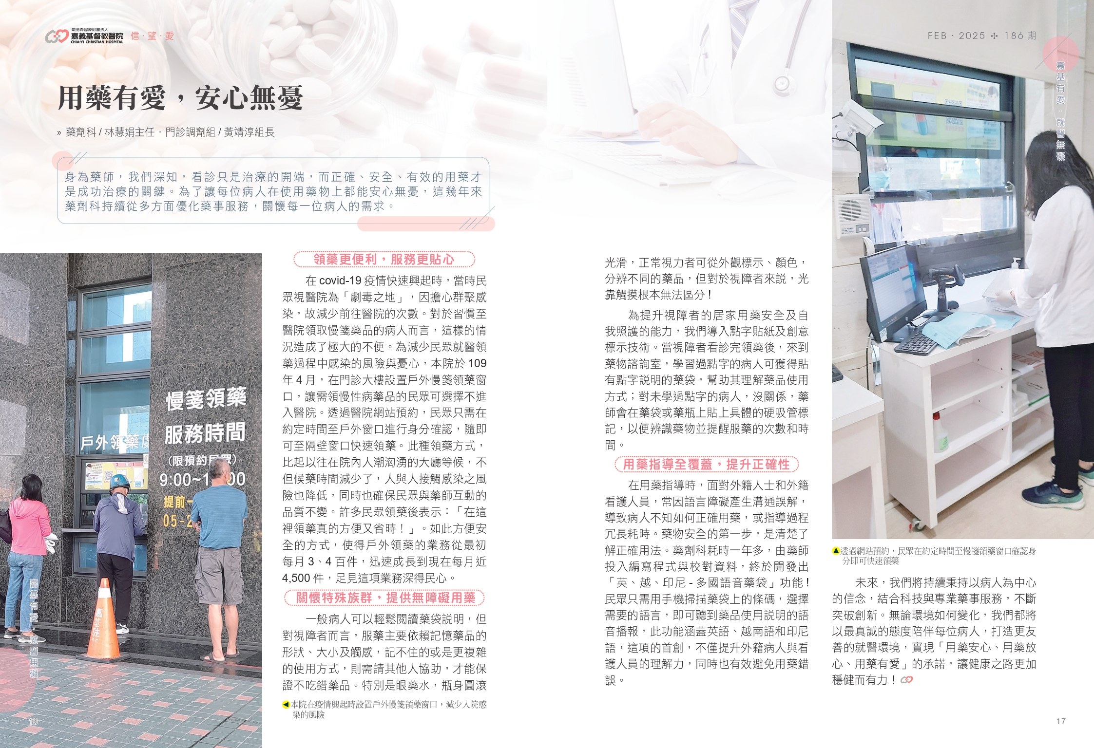 身為藥師,我們深知,看診只是治療的開端,而正確、安全、有效的用藥才是成功治療的關鍵。為了讓每位病人在使用藥物上都能安心無憂,這幾年來藥劑科持續從多方面優化藥事服務,關懷每一位病人的需求。