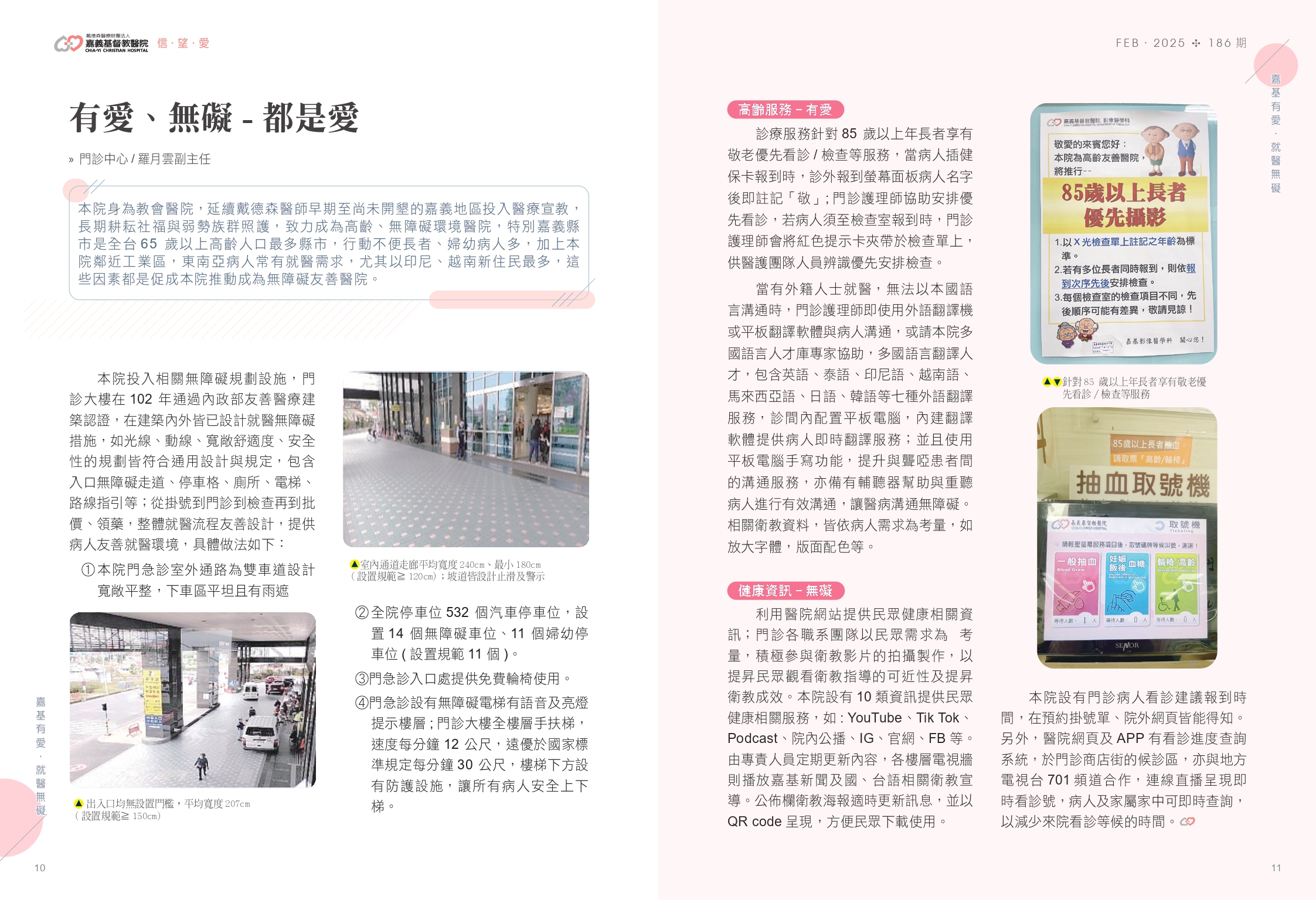 本院身為教會醫院,延續戴德森醫師早期至尚未開墾的嘉義地區投入醫療宣教,長期耕耘社福與弱勢族群照護,故本院致力成為高齡、無障礙環境醫院,特別嘉義縣市是全台65 歲以上高齡人口最多縣市,行動不便長者、婦幼病人多,加上本院鄰近工業區,東南亞病人常有就醫需求,尤其以印尼、越南新住民最多,這些因素都是促成本院推動成為無障礙友善醫院。