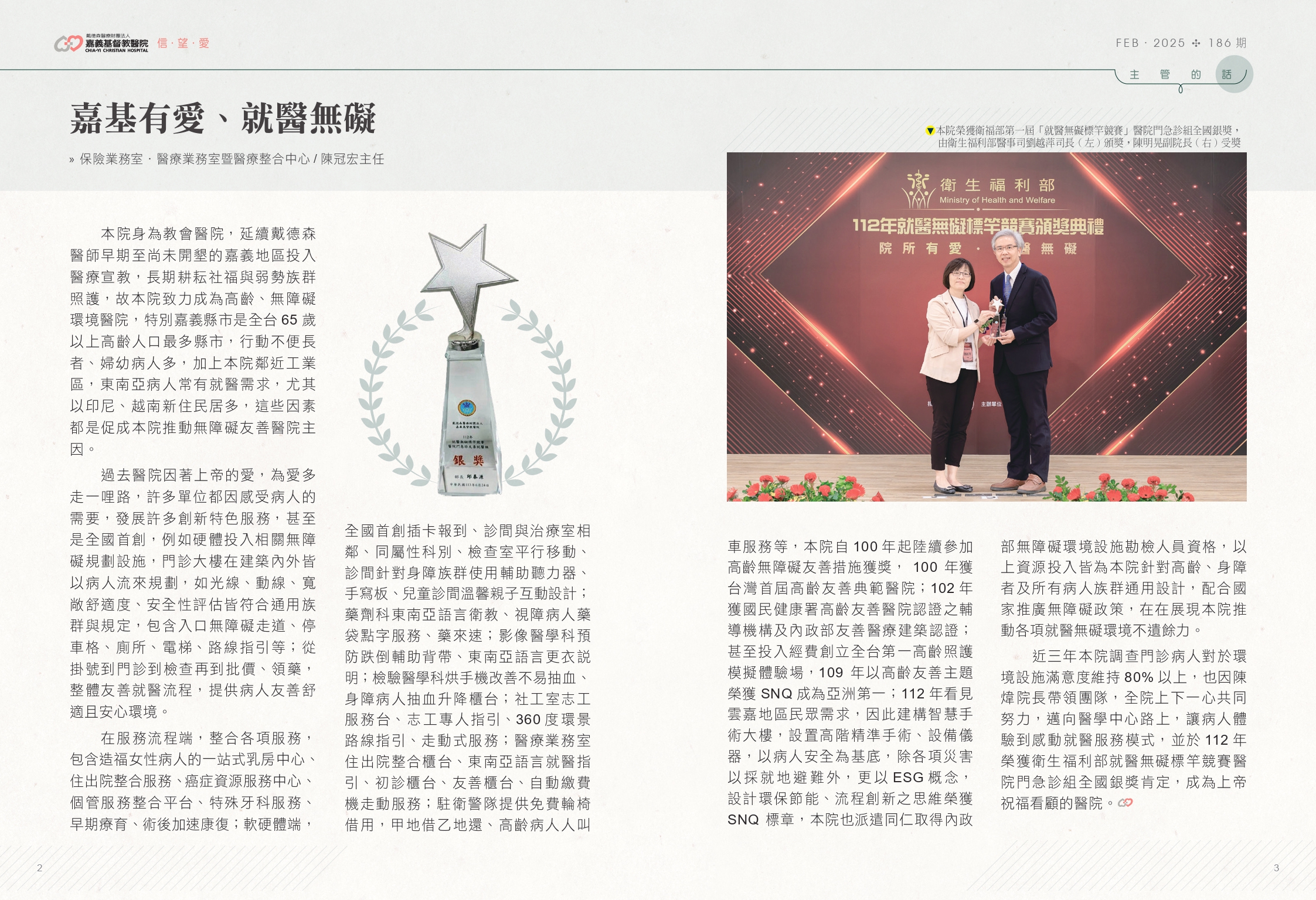 近三年本院調查門診病人對於環境設施滿意度維持80%以上,也因陳煒院長帶領團隊,全院上下一心共同努力,邁向醫學中心路上,讓病人體驗到感動就醫服務模式,並於112年榮獲衛生福利部就醫無礙標竿競賽醫院門急診組全國銀獎肯定,成為上帝祝福看顧的醫院。