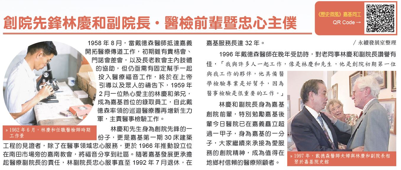 林慶和先生身為創院先鋒的一份子,更是嘉基第一期30床建築工程的見證者,除了在醫事領域忠心服務,更於1966年推動設立位在南田市場旁的嘉南教會,將福音分享到社區。隨著嘉基發展更承擔起醫療副院長的責任,林副院長忠心服事直至1992年7月退休,在嘉基服務長達32年。